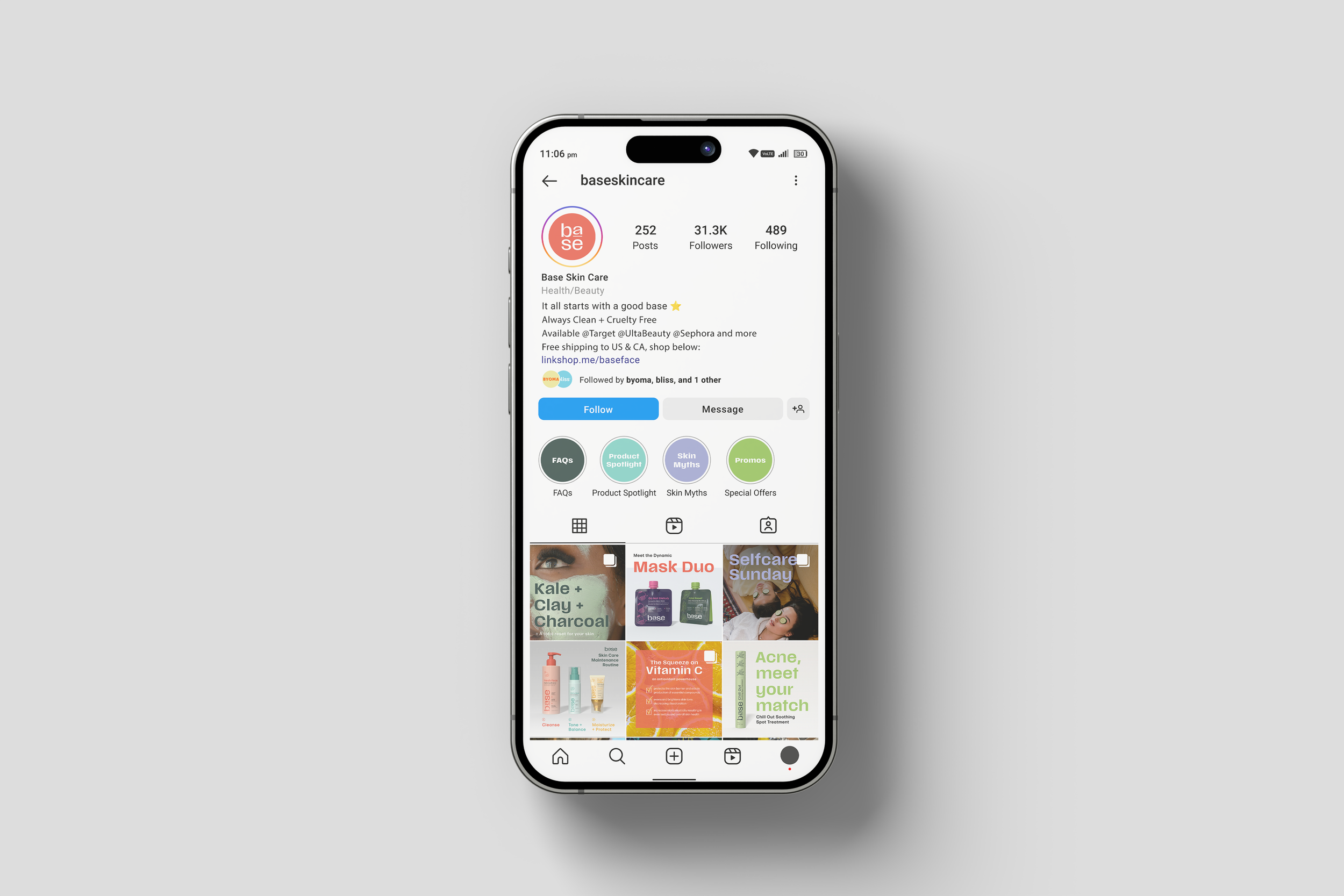 To bring the brand to life, I developed a social media presence geared toward the average skincare novice. Posts focus on ingredient spotlights and product education without any confusing jargon. Base is skincare made simple.
